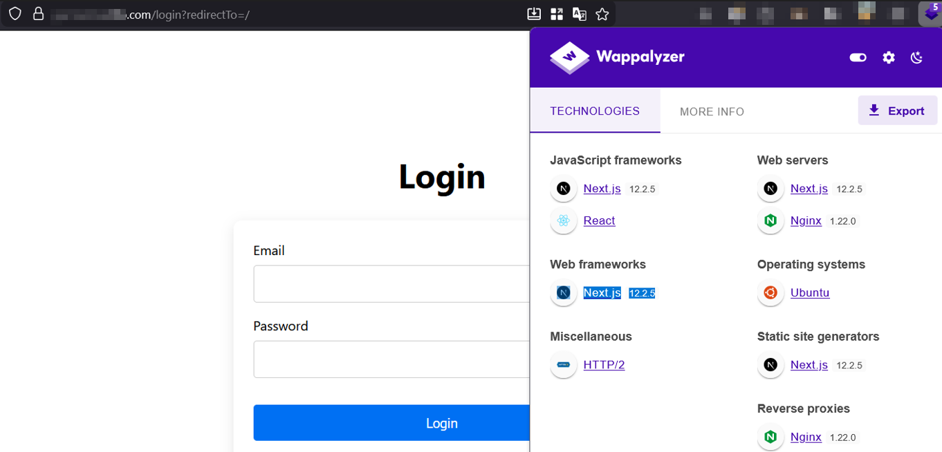 First, we encounter a standard login page protecting the application. By using browser fingerprinting tools like Wappalyzer, we can confirm the underlying tech stack. As seen below, the target application is running Next.js 12.2.5, which falls directly within the vulnerable version range.