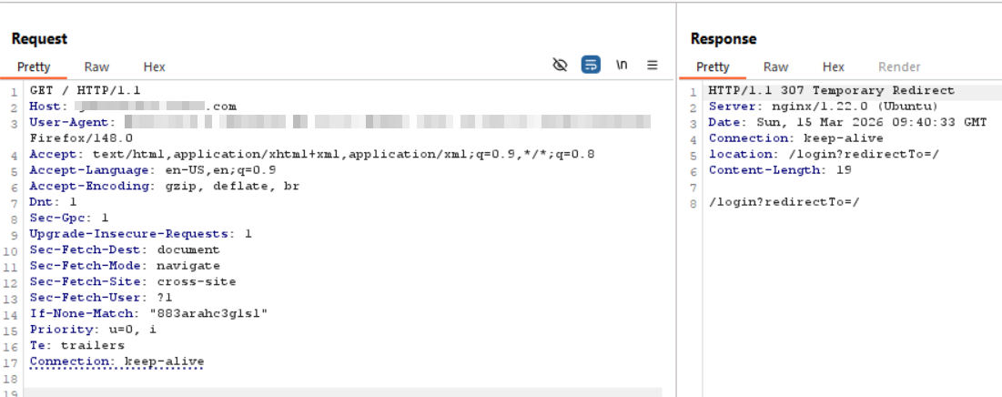 Next, we attempt to access a protected route without valid credentials. Intercepting this initial GET request in an HTTP proxy, we see the expected, secure behavior: the Next.js middleware successfully catches our unauthenticated request and issues a 307 Temporary Redirect, pushing us back to the /login page.