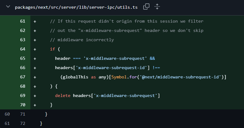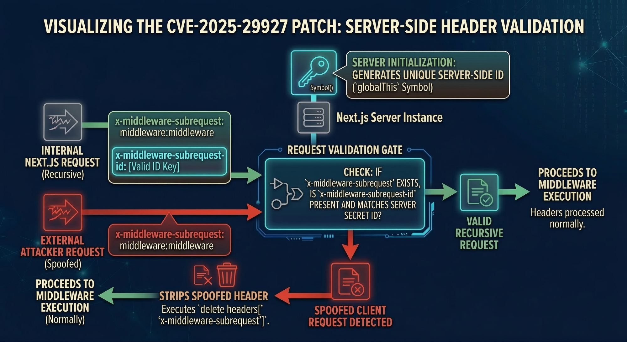 If the ID is missing or incorrect, Next.js deletes the attacker-controlled subrequest header before the middleware routing logic sees it.