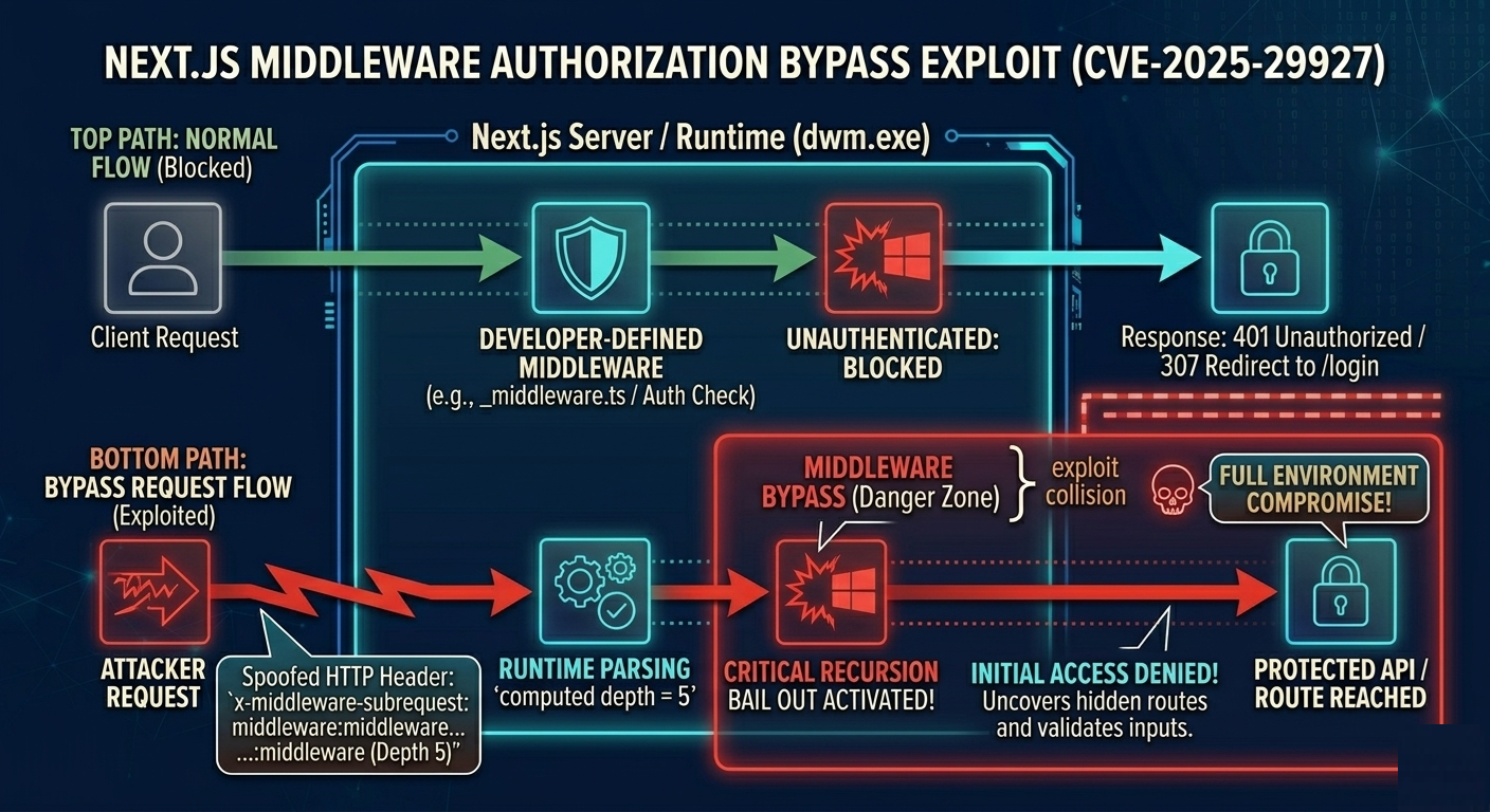 CVE-2025-29927 is a reminder that framework middleware, no matter how convenient, is not a security boundary you can safely bet everything on. The underlying flaw was simple: an internal header used for recursion tracking was trusted from external requests, allowing attackers to short-circuit middleware execution.