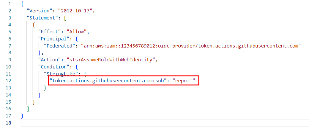 This is catastrophic because repo:* does not restrict access to a specific GitHub organization or repository. It can allow any repository on GitHub.com, including attacker-controlled repositories, to produce a JWT that satisfies the role trust conditions.