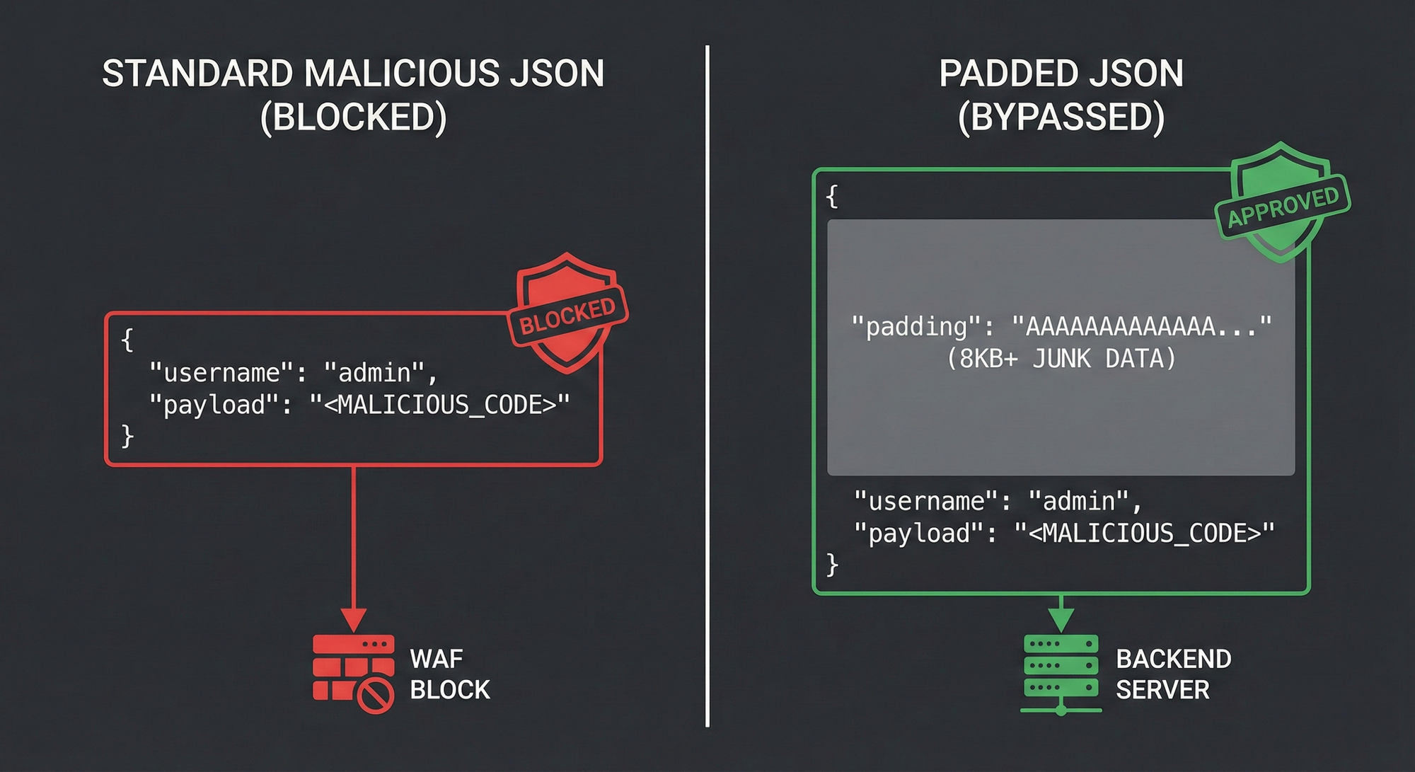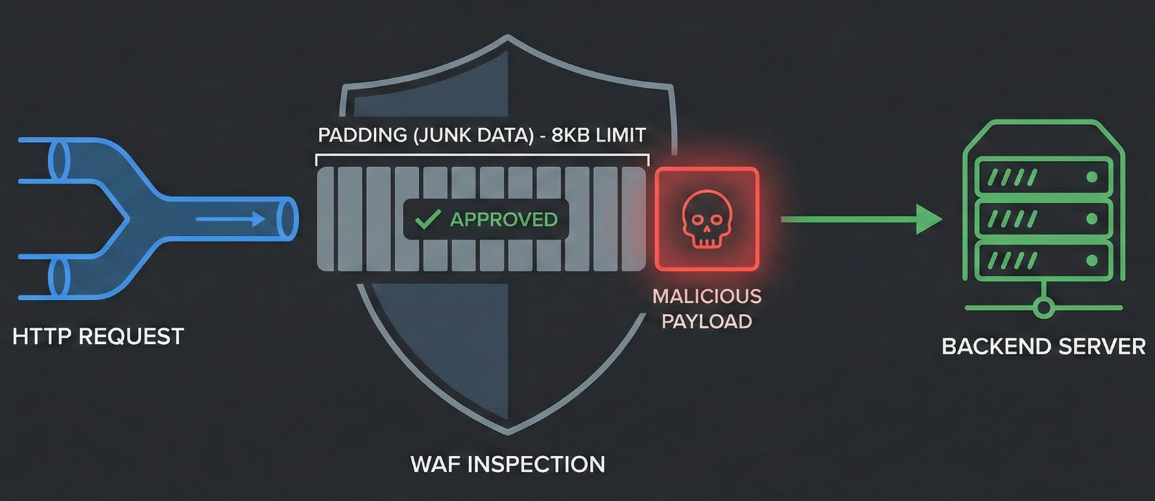 Payload padding exploits a practical constraint in many Web Application Firewalls (WAFs): to preserve latency and throughput, they often inspect only the first N kilobytes of an HTTP request body. By placing benign “junk” content up front and moving the malicious payload past that inspection boundary, an attacker can cause the WAF to approve the request while the origin application still processes the full body.