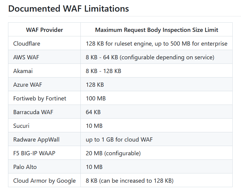 To keep systems responsive, many WAFs implement a request body inspection limit.