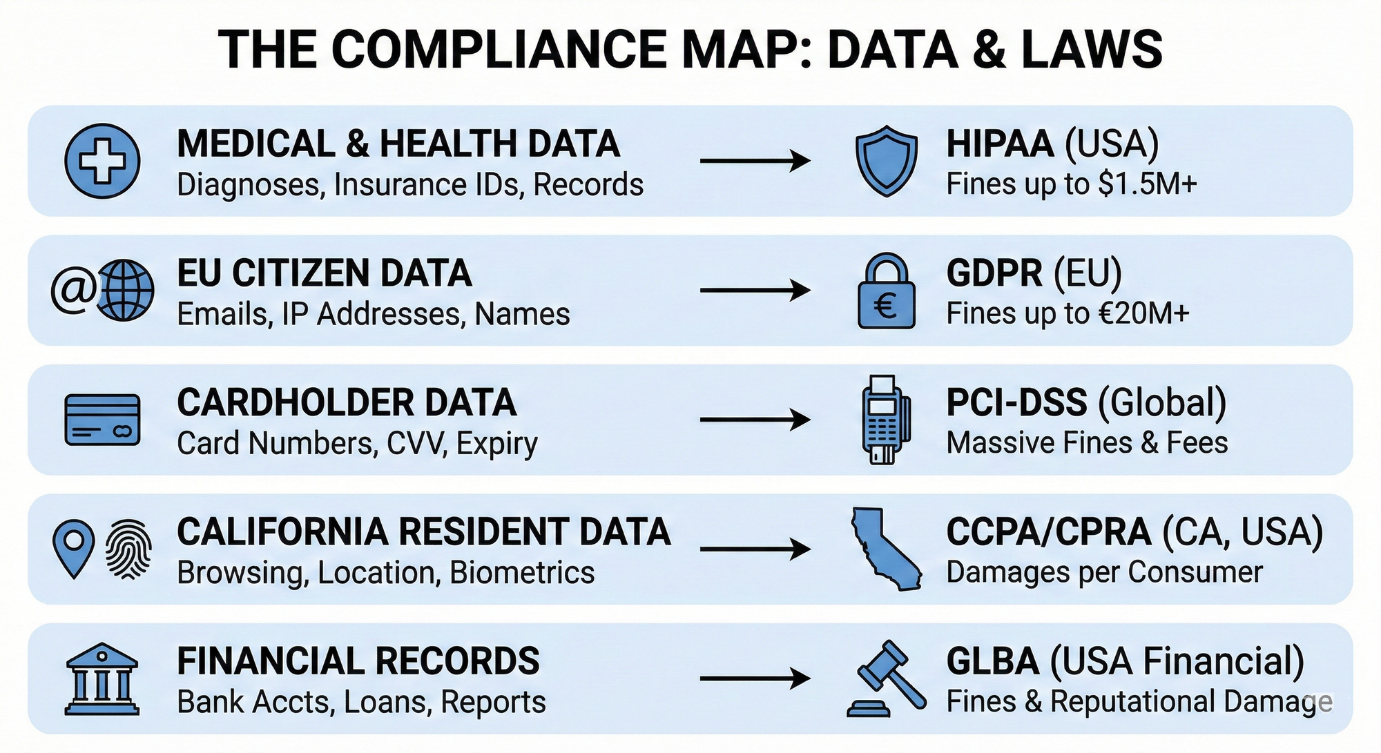 Financial institutions must protect customer data and provide clear privacy notices. While GLBA fines vary, the reputational damage from leaking financial records can be even more costly than regulatory penalties.