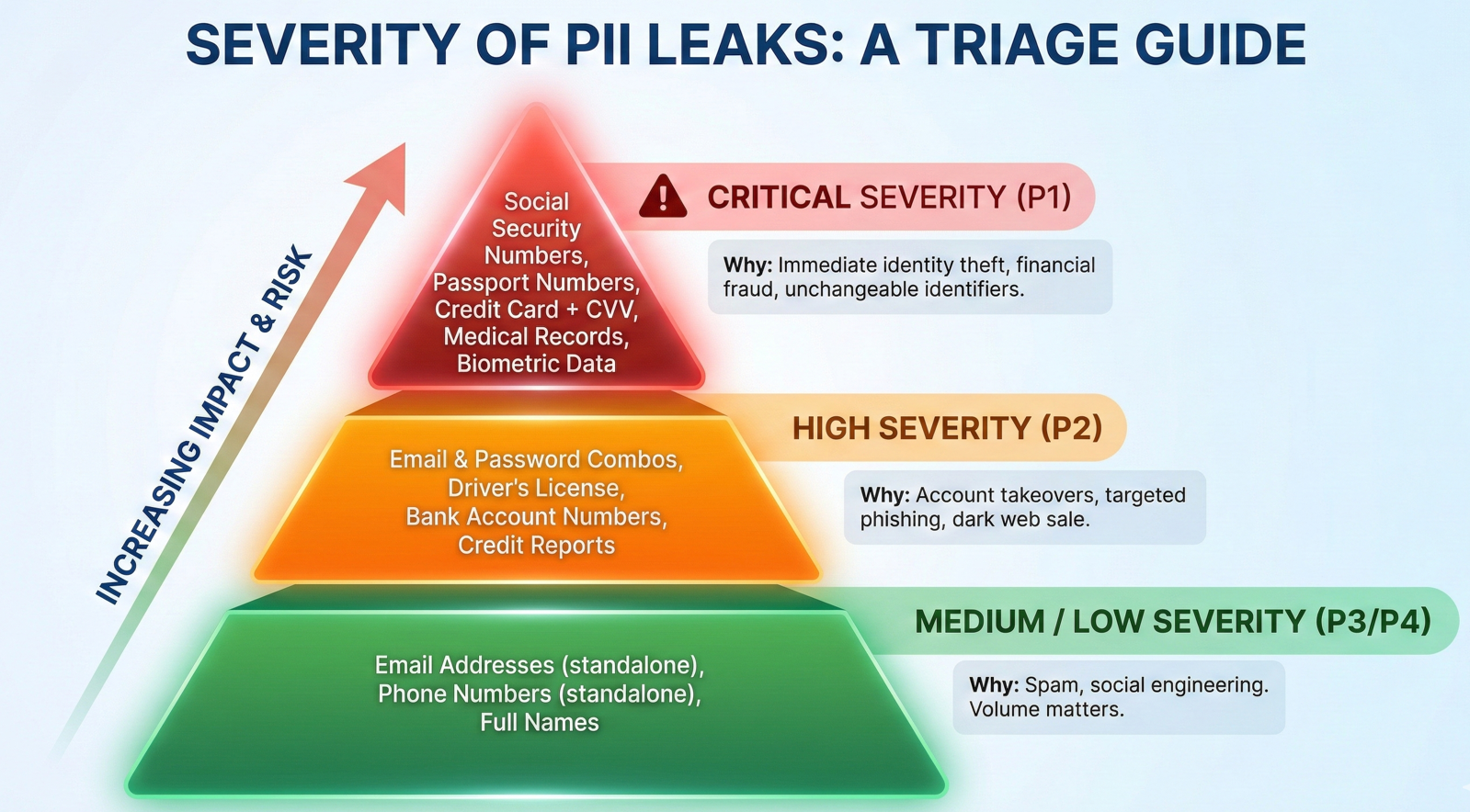 Not all PII leaks are created equal. When you're triaging security findings, you need to understand the real-world impact. Here's how to think about severity:
