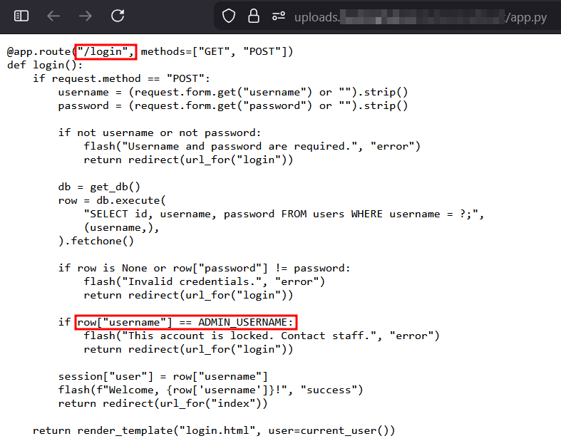 2) In the /login route, the code tries to prevent brute force attacks on the real admin by checking: if row["username"] == ADMIN_USERNAME: If this exact match triggers, the account is locked or treated specially.