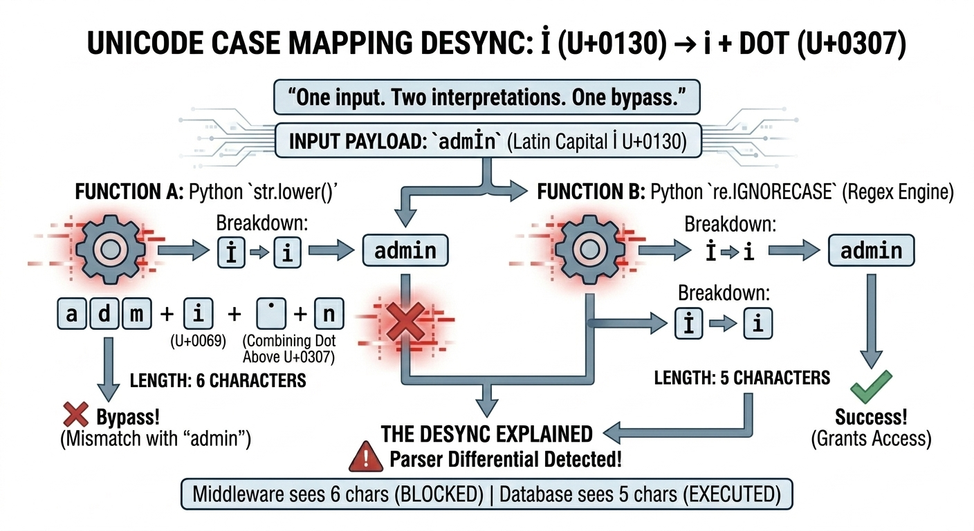 The regex engine’s case-insensitive mapping uses a simpler (C-level) conversion that treats İ differently. In this path, the İ is mapped down in a way that matches a normal i, so: re.match(r"^admin$", "admİn", re.IGNORECASE) evaluates to True.