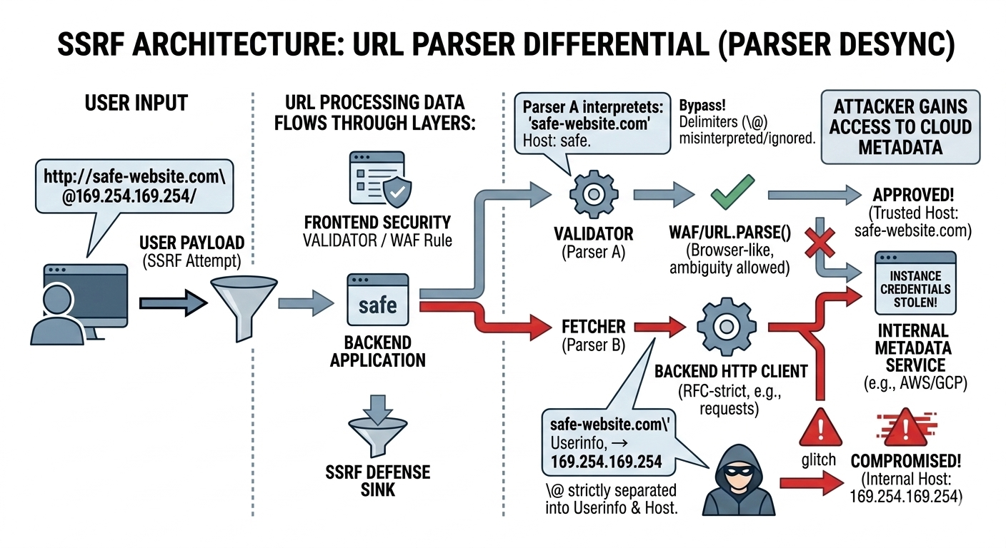 If they use different parsers, attackers can craft a URL that appears safe to the validator but resolves to an internal target for the fetcher.