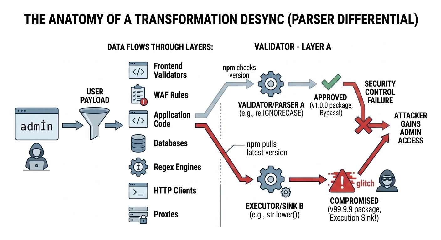 When you have access to source code, the job is no longer only to find insecure functions. The more powerful approach is to look for logic desynchronization: points where the application assumes that two libraries interpret a value in the same way, even though they do not. These are parser differentials, also called transformation desyncs. They happen when: