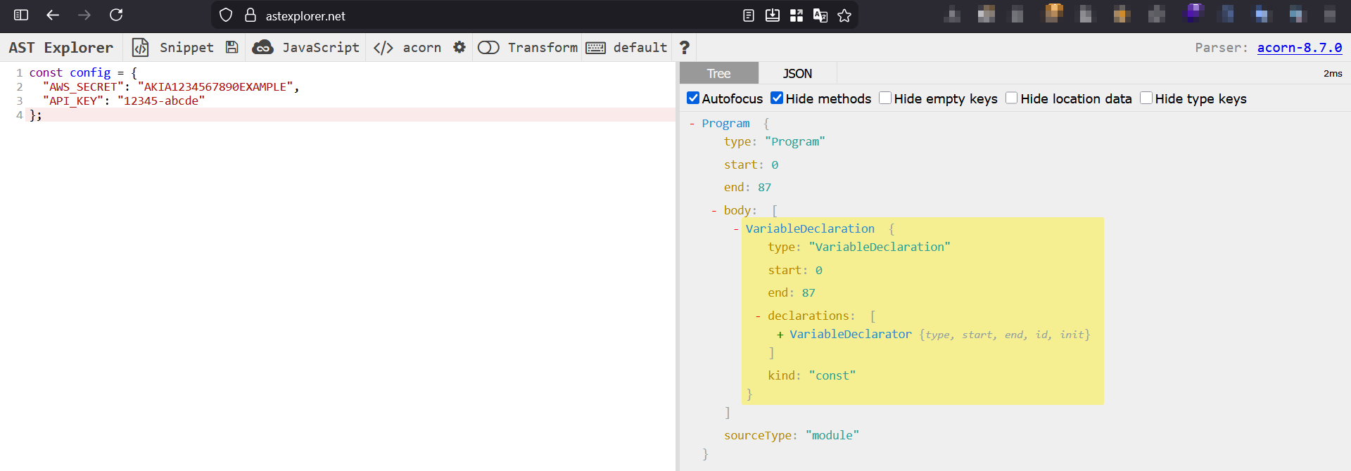 Traditional secret scanning in security research often starts with: grep or similar CLI tools. Tools like Jsmon are built around this model, using regex as a first pass and Abstract Syntax Trees (ASTs) for the deeper, contextual analysis.