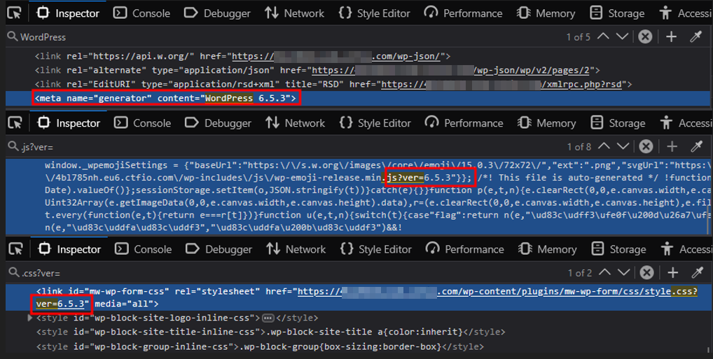 Even if the generator tag is removed, plugins and themes frequently leak the WordPress version through their assets. This is an important detail: many teams focus on hiding the obvious marker but overlook the indirect ones.